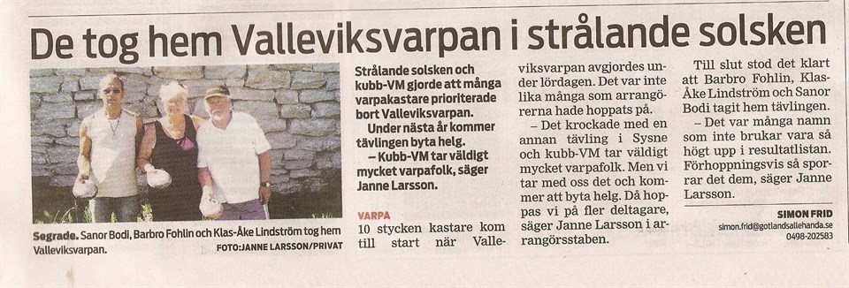 Valleviksvarpan 3 augusti kastas i 3-manna lag. Blandade lag och fritt kastavstånd (inom rimliga gränser) Som vi har kastat de andra åren så är det med dubbelstick och det lag som INTE tar sticket servar på nästa kast. NYHET för i år är att vi kastar på tjocka pinnar som används i stenvarpa och man får då poäng för pinne också, skulle båda lagen få varisn pinne så räknas de. ( vissa justeringar av regler och handikapp kan förekomma) Anmälningsavgift är 300:- / lag. Sista anmälan är den 2 augusti. Anmälan till Janne 070- 437 61 70 -//- Jan-Inge 073- 666 75 99